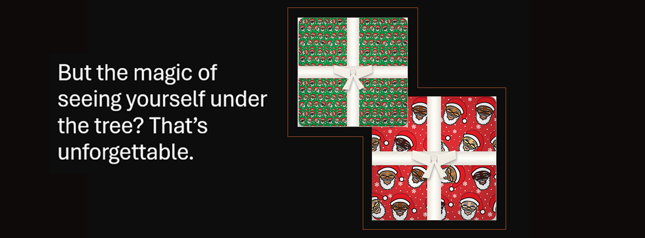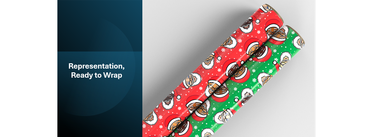 Introducing the world’s first Diverse Emoji Santas — five beautiful skin tones on vibrant red and green premium wrapping paper. Each roll is representation under the tree. Legacy in your hands. History wrapped in joy.